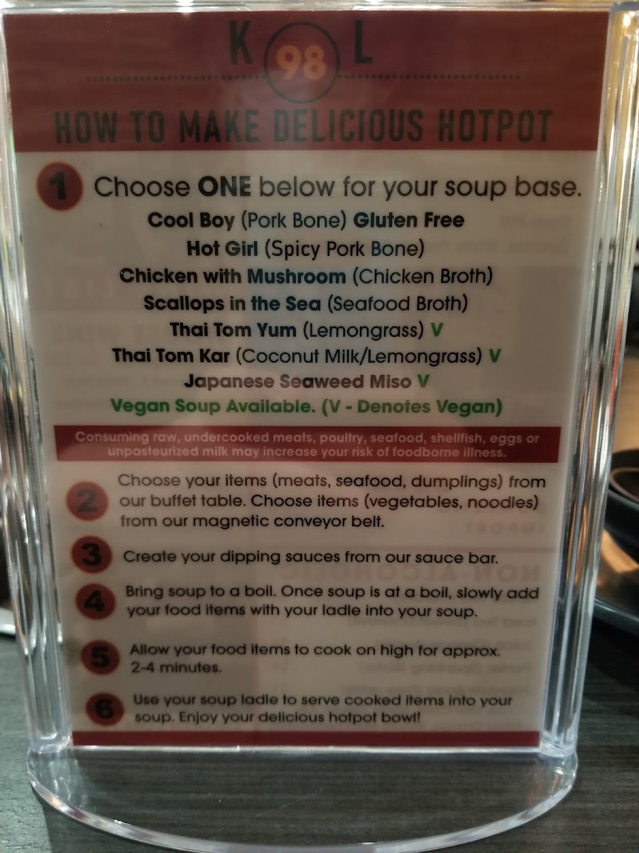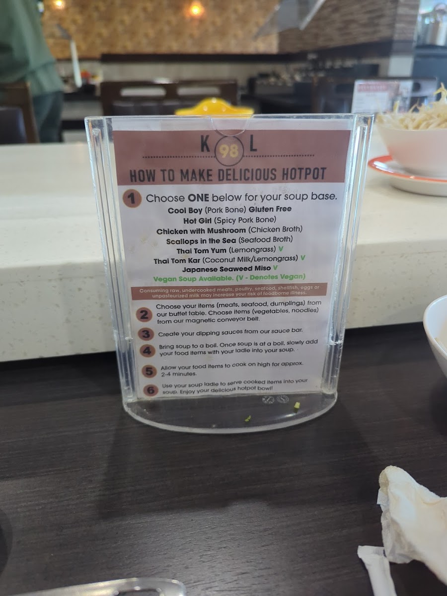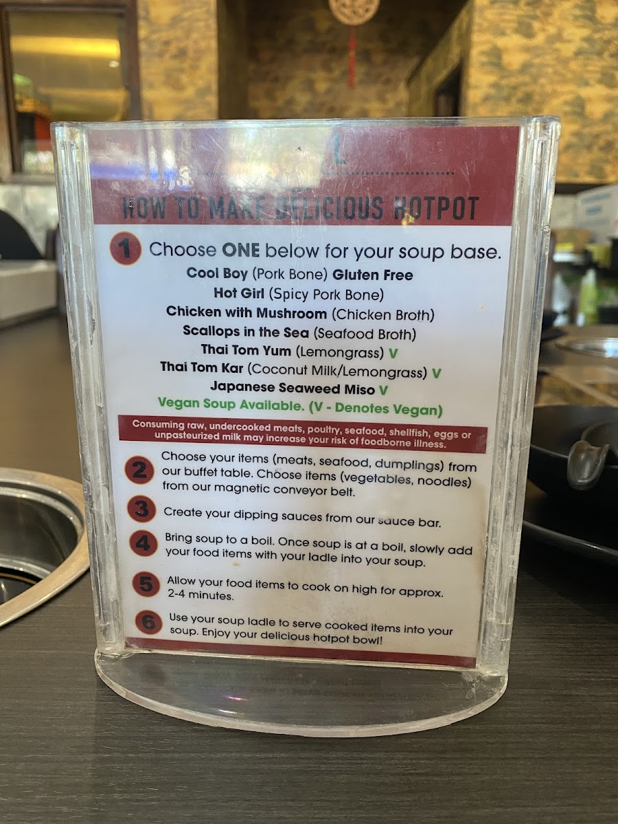 (Pork bone) gluten free choose your items from our buffet table. Choose items from our magnetic conveyor belt. Create your dipping sauces from our sauce bar. Bring soup to a boil. Once soup is at a boil, slowly add your food items with your ladle into your soup. Allow your food items to cook on high for approx. 2-4 minutes. Use your soup ladle to serve cooked items into your soup bowl. Enjoy your delicious hotpot!