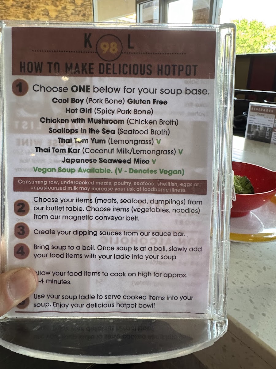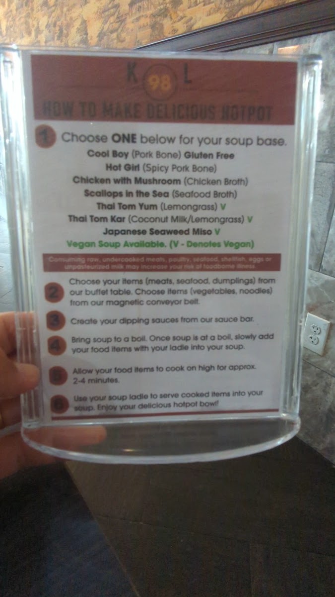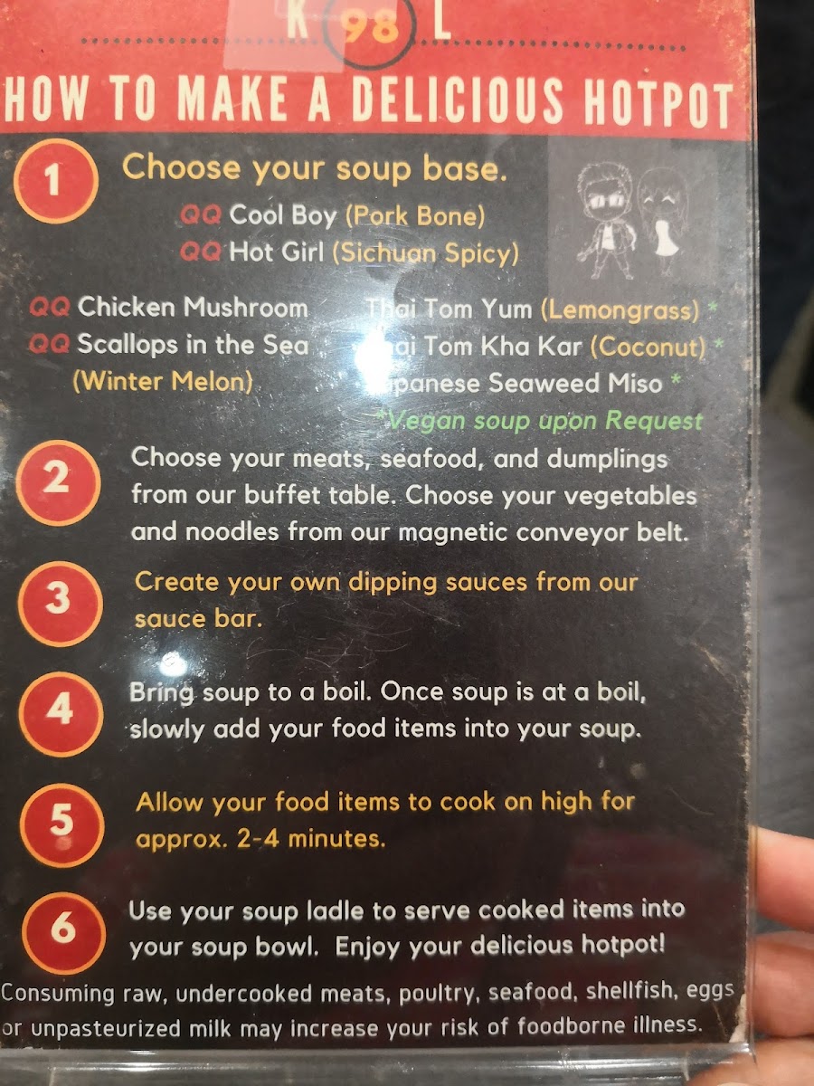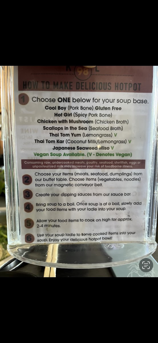 (Pork bone) gluten free choose your items from our buffet table. Choose items from our magnetic conveyor belt. Create your dipping sauces from our sauce bar. Bring soup to a boil. Once soup is at a boil, slowly add your food items with your ladle into your soup. Allow your food items to cook on high for approx. 2-4 minutes. Use your soup ladle to serve cooked items into your soup bowl. Enjoy your delicious hotpot!